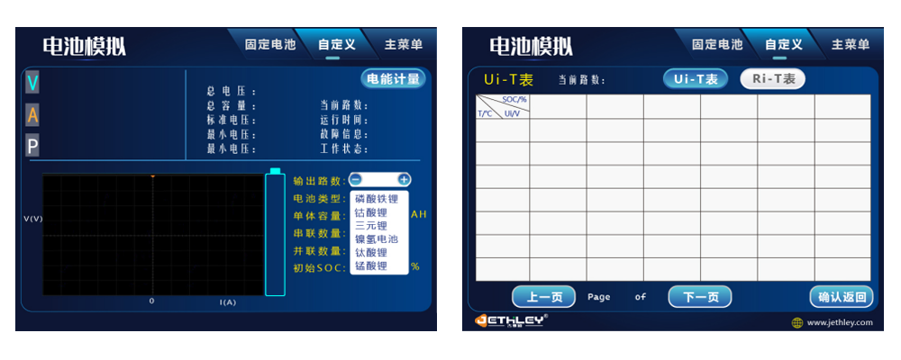 ◇电池模拟功能具备模拟多种电池的充放电的特性,用户可选择模拟不同电池的类型、串联节数、并联节数及 SOC指 标,从而全面模拟电池的输出特性,包括了电池放电过程中电池内阻特性变化的过程;