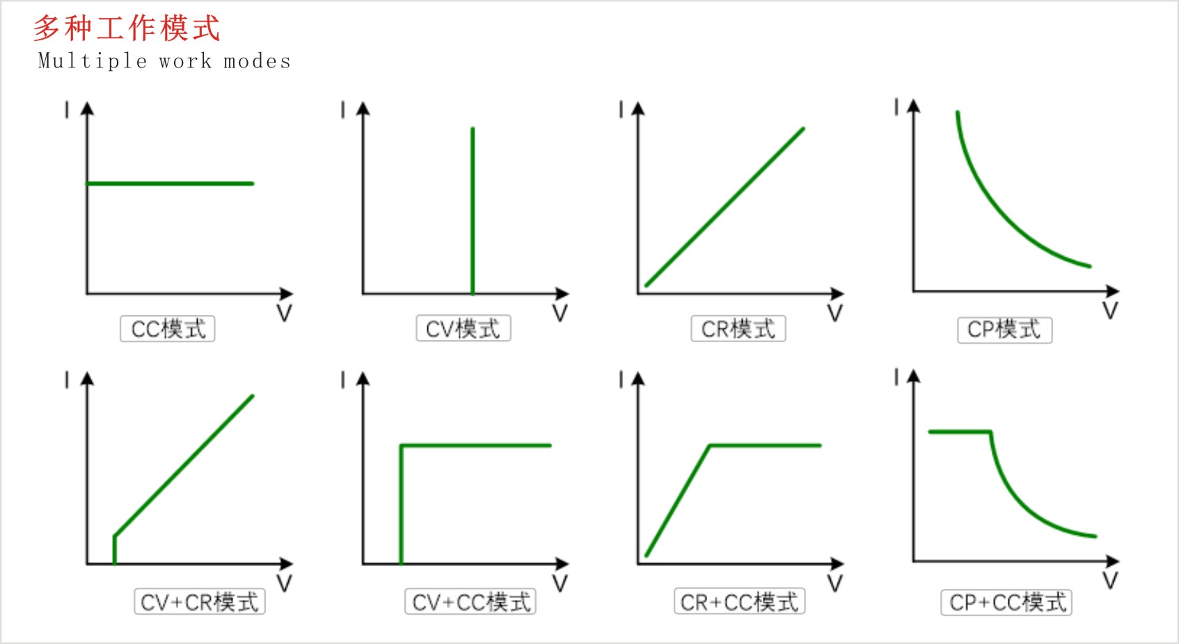 多种工作模式:CC、CV、CR、CP、CV+CC、CR+CC、CV+CR、CP+CC;