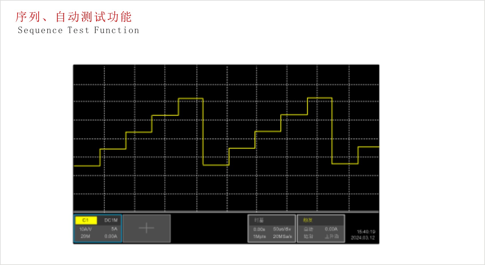 ◉  二十余种测试功能:序列测试,自动测试,短路模拟,时间测量,放电测试,内阻测试,电压峰值、过流测试,过功率测试,扫频测试,负载效应,LED模拟,正弦波功能等;