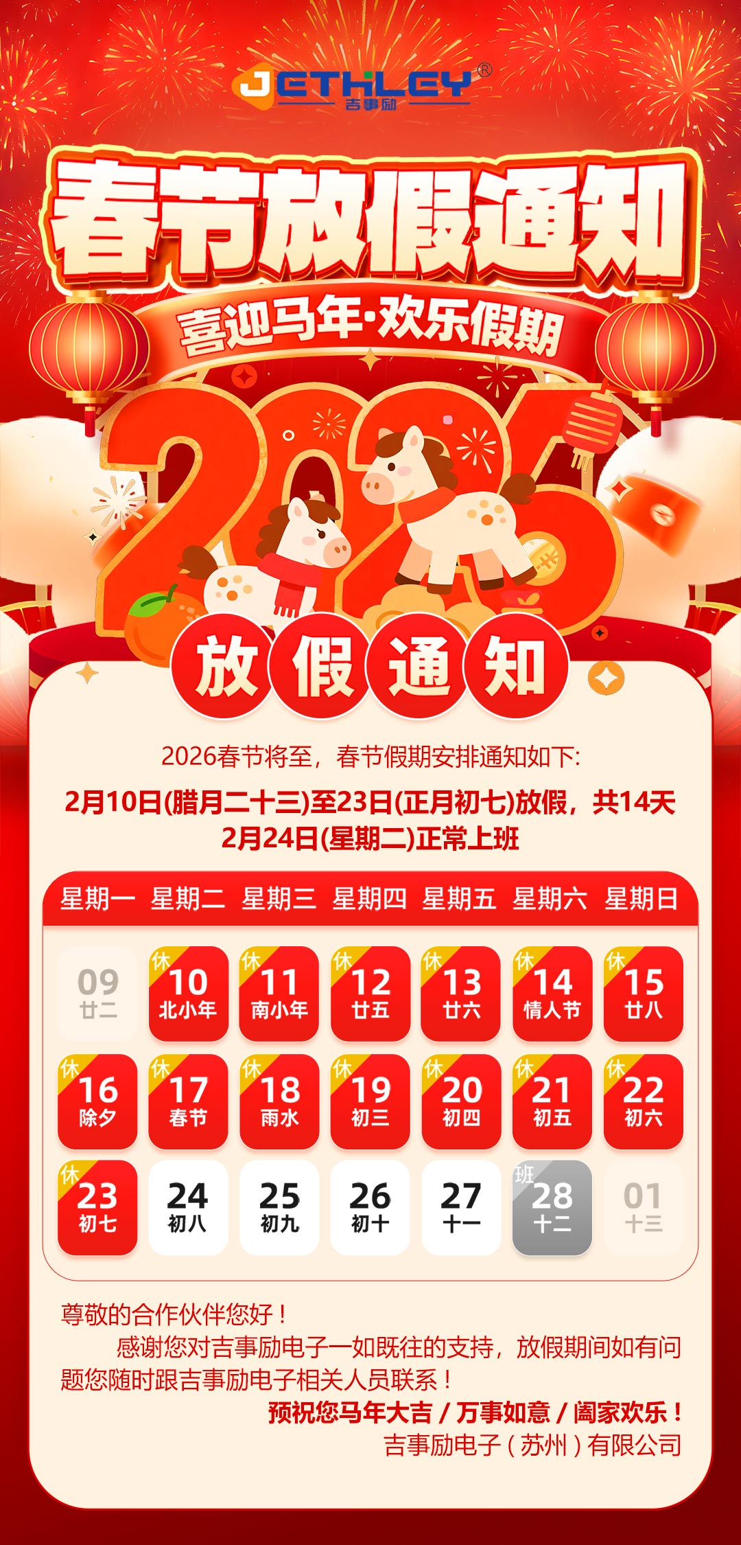 春节将至,根据国务院办公厅关于2026年春节放假通知并结合公司实际情况,现将春节放假时间具体安排如下: